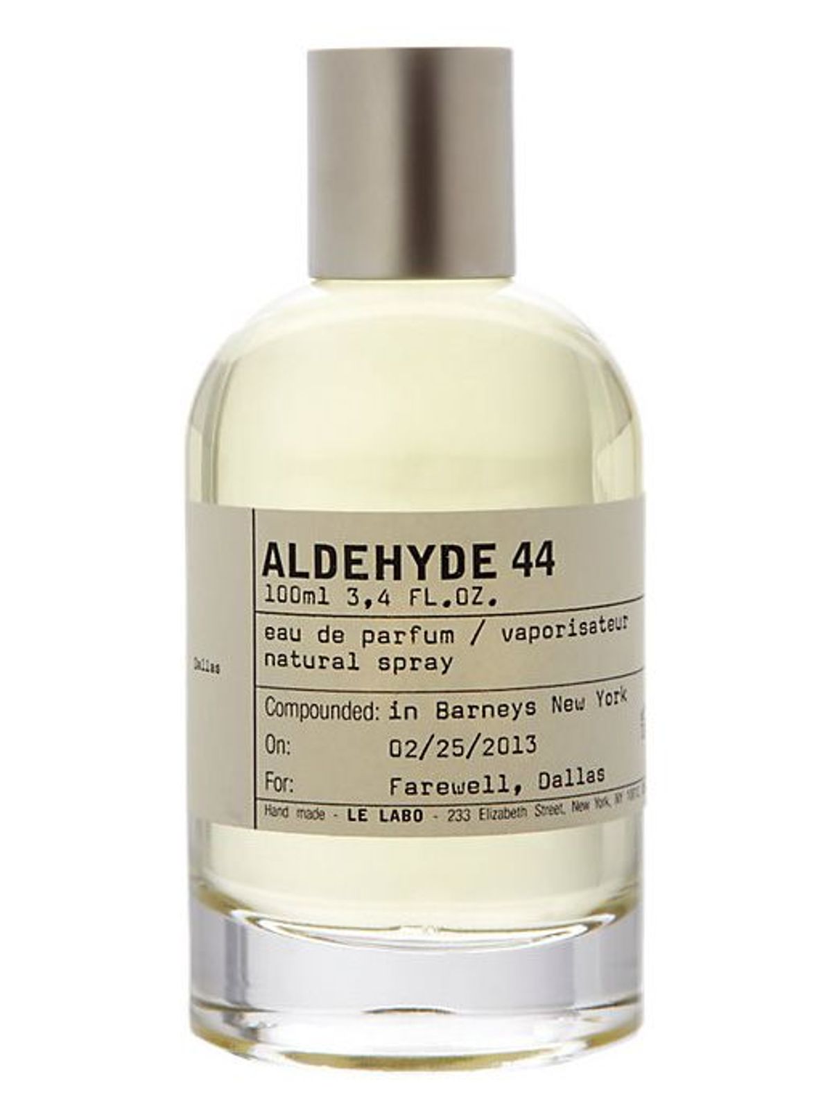 Aldehyde 44 Dallas dành cho nam lẫn nữ ra đời từ phòng thí nghiệm sáng tạo của Yann Vasnier tại Le Labo vào năm 2006, một giai đoạn đánh dấu sự trở lại của sự yêu thích đối với tính thẩm mỹ thô ráp, công nghiệp của New York giữa thế kỷ 20. Vasnier tìm cách nắm bắt năng lượng sôi động của thành phố và những dòng chảy tinh tế, gần như vô hình của nó bằng cách chưng cất một mùi hương vừa hùng vĩ vừa thân mật. Nước hoa là một lời tri ân đến các chiến dịch quảng cáo mang tính biểu tượng của thời đại và vẻ ngoài kim loại lấp lánh của đường chân trời thành phố, được chuyển đổi thành một ngôn ngữ khứu giác cân bằng sự tinh tế hiện đại với sự vang vọng vượt thời gian, gần như hoài cổ.
